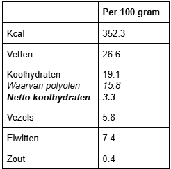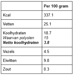 Ingrediënten: vrije uitloop ei, witte chocolade (cacaoboter, erythritol, volle melkpoeder), amandelmeel, wortel, gesuikerde walnoot (walnoot, erythritol, roomboter, kaneel, vanille poeder, roze himalaya zout), roomkaas, erythritol, lijnzaadmeel, wei poeder (wei proteïne, 1,5% zonnebloemlecithine), psyllium husk vezels, wijnsteenbakpoeder sinaasappel rasp, speculaaskruiden, roze himalaya zout