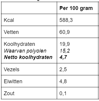 Ingrediënten: pecannoot, witte chocolade (cacao boter, erythritol, volle melkpoeder), roomboter, erythritol, slagroom, vanille poeder, zout
